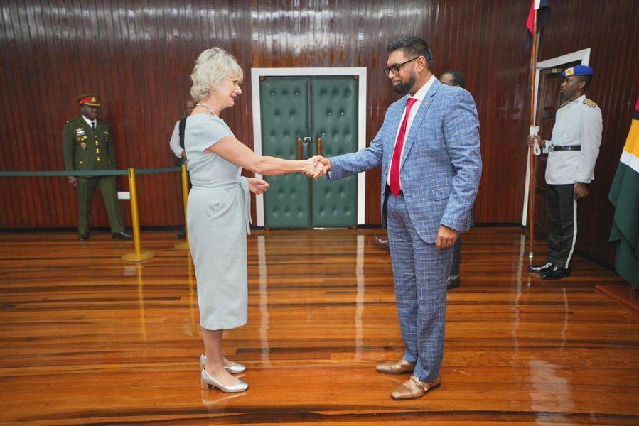 His Excellency President Dr Irfaan Ali received the Letters of Credence from the Non-Resident Ambassador of Ireland to the Cooperative Republic of Guyana, Her Excellency Fiona Flood, at the Office of the President at Shiv Chanderpaul Drive today.