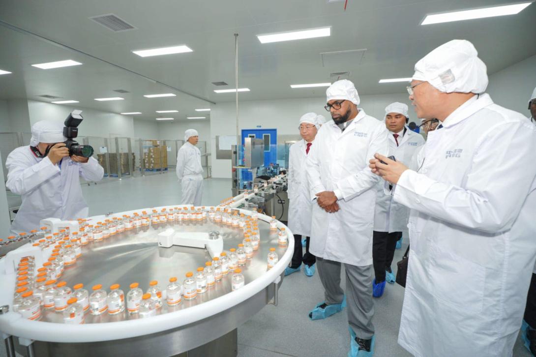 His Excellency President Dr Irfaan Ali toured the Chengdu Ronsheng Pharmaceutical Company-an affiliate of the China National Pharmaceutical Group Co. Ltd (Sinopharm), today.
