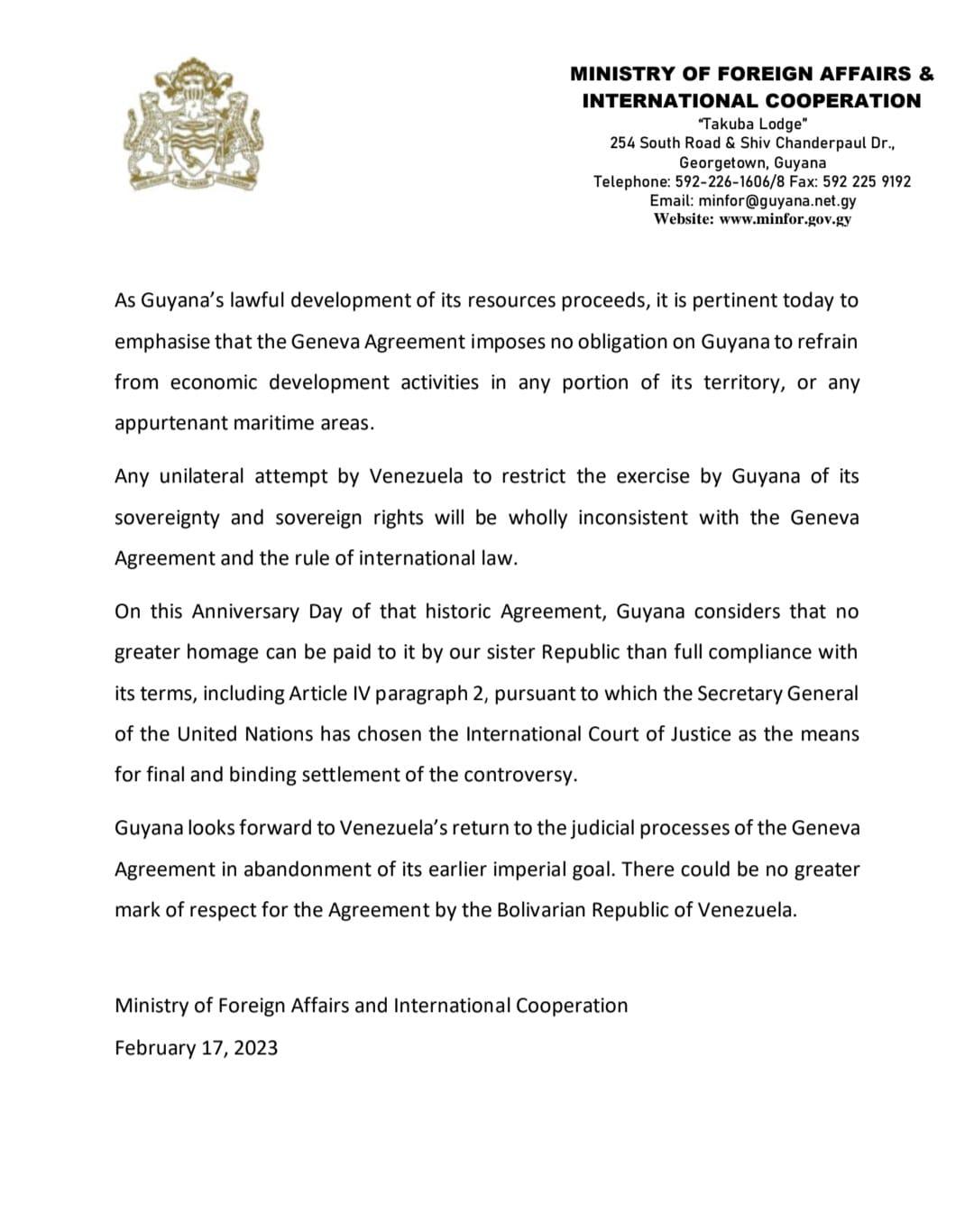 Today marks the 57th Anniversary of the signing of the Geneva Agreement and invites its commemoration as a binding international agreement between the Parties. Concluded on the eve of our country's independence between the United Kingdom, Venezuela and British Guiana, it governs the resolution of the controversy which had arisen as a result of Venezuela's baseless and ill-chosen contention that the Arbitral Award of 1899 is 'null and void'. It removed the roadblock to Guyana's independence that Venezuela had, with imperial ambition, sought to effect.