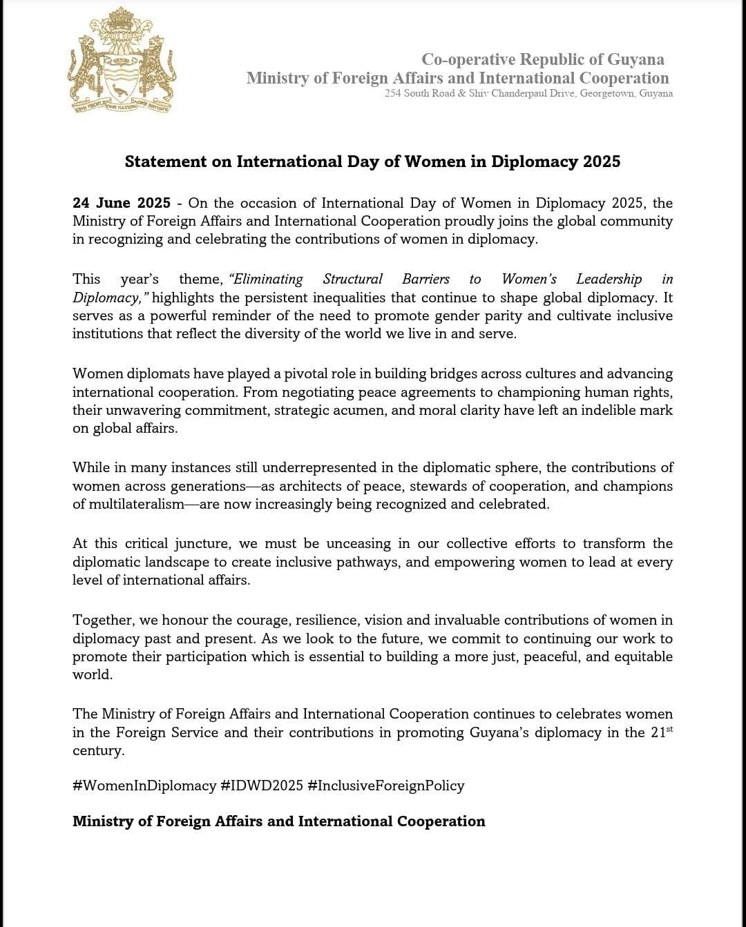 Statement on the occasion of International Day of Women in Diplomacy