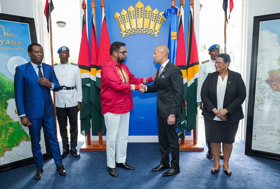 His Excellency President Dr Irfaan Ali accepted the Letters of Credence from the Ambassador of the Dominican Republic to Guyana, HE Ernesto Torres Pereyra at State House this afternoon.