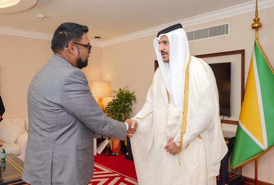 His Excellency President Dr Irfaan Ali held bilateral discussions with Qatar’s Minister of Commerce and Industry, Sheikh Mohammed bin Hamad bin Qassim Al Abdullah Al Thani in Doha today.