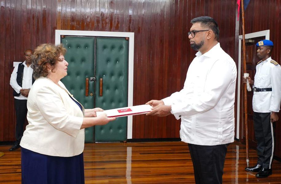 President Dr. Irfaan Ali officially welcomed HE Bengü Yiğitgüden as the Turkish Non-Resident Ambassador Extraordinary and Plenipotentiary to Guyana during a ceremony held at the Office of the President on Shiv Chanderpaul Drive.